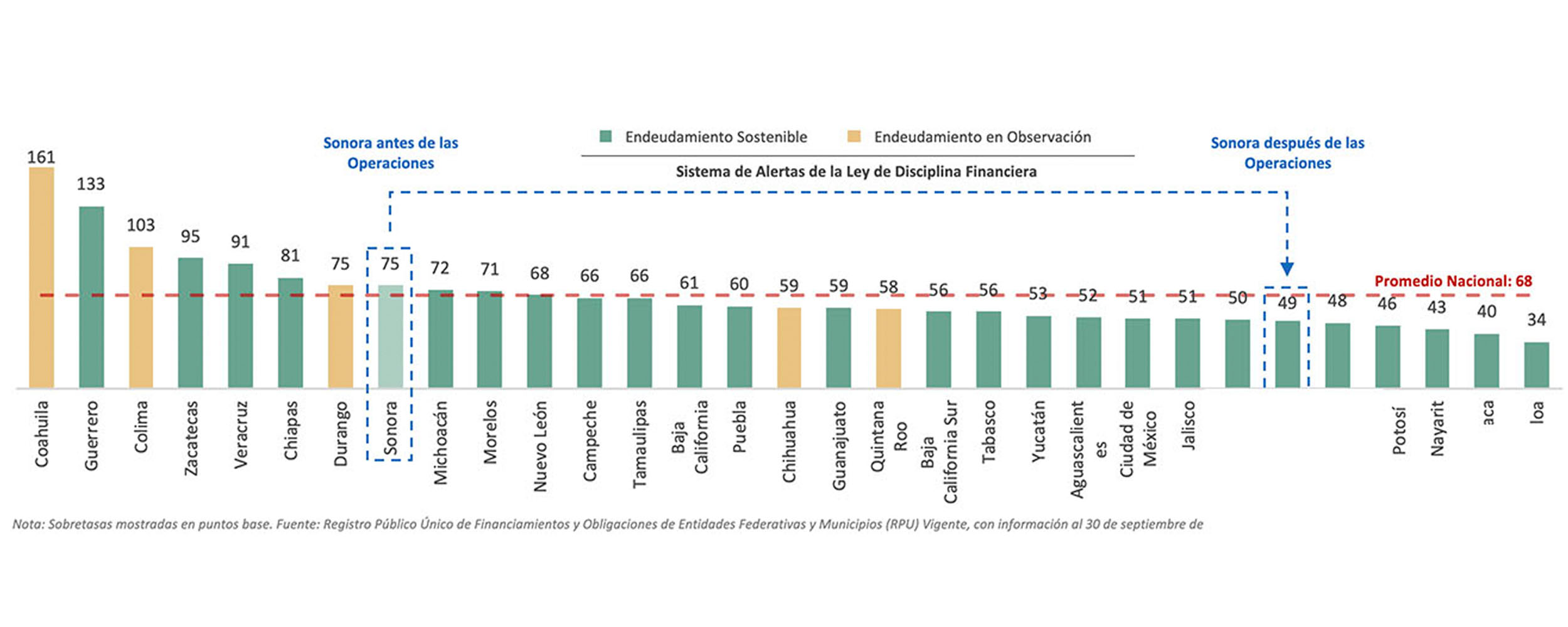 - Reducción de sobretasa promedio, al pasar de 0.74% (sobre el promedio nacional de 0.68%) a 0.49%; llevando al Estado desde el octavo lugar entre las Entidades con mayor sobretasa hasta el sexto lugar entre las Entidades con menor costo financiero.